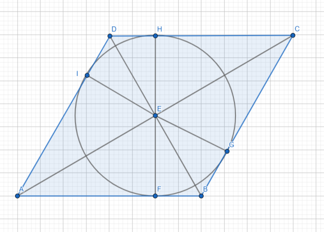 Zauważ, że figury EFBG i EHDI są deltoidami przystającymi o dwóch kątach prostych. Odcinki HF i IG są wysokościami, więc czworokąt ABCD musi być równoległobokiem. Trójkąty ADB i CDB są przystające z cechy kąt – bok – kąt, więc wszystkie boki równoległoboku są równe. Z tego wynika, że ten równoległobok jest rombem.
