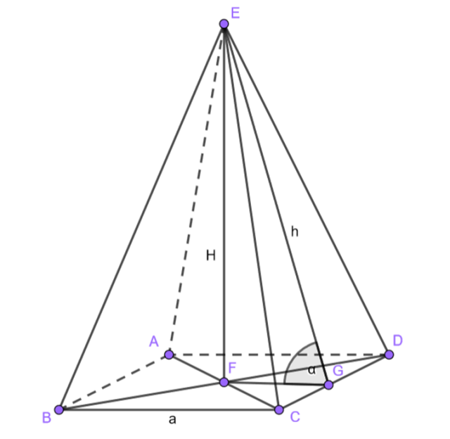 Stwórz rysunek pomocniczy, gdzie H to wysokość ostrosłupa, a to długość krawędzi, h to wysokość ściany bocznej, α to kąt pomiędzy ścianą i podstawą: