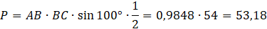 Policz pole trójkąta ABC, gdzie długość boku |AB| wynosi 9, |BC| wynosi 12, a miara kąta ∢ABC wynosi 100°, zachowując dokładność do dwóch miejsc po przecinku.
