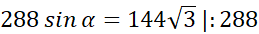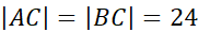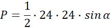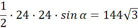 W tym zadaniu podaj, ile wynosi kąt znajdujący się między ramionami trójkąta równoramiennego ABC, którego ramiona mają długości po 24, a jego pole jest równe