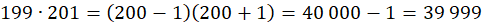 Zapisz 199 jako różnicę dwóch liczb i 201 jako sumę dwóch liczb. Następnie użyj wzoru skróconego mnożenia: