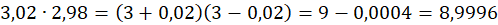 Zapisz 2,98 jako różnicę dwóch liczb i 3,02 jako sumę dwóch liczb. Następnie użyj wzoru skróconego mnożenia: