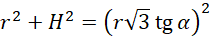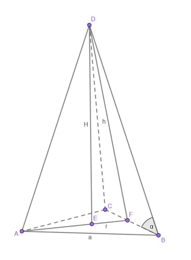 Stwórz rysunek pomocniczy, gdzie H to wysokość ostrosłupa, r to promień okręgu wpisanego, a to krawędź podstawy, h to wysokość ściany bocznej, α to kąt podany w poleceniu: