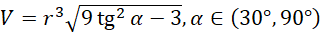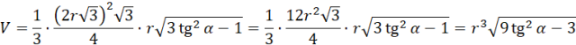 Mając dany ostrosłup prosty, którego podstawą jest trójkąt równoboczny, w który wpisano okrąg o promieniu r oraz wiedząc, że kąt, który tworzy krawędź boczna i krawędź podstawy, jest równy α, określ objętość bryły oraz α, dla których to zadanie jest rozwiązywalne.