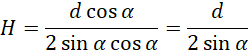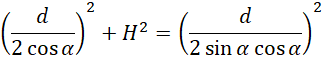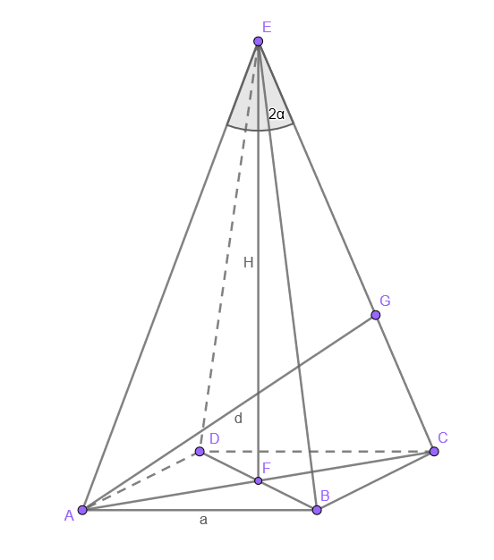 Stwórz rysunek pomocniczy, gdzie H to wysokość ostrosłupa, d to odległość wierzchołka od krawędzi bocznej, a to krawędź podstawy, 2α to kąt podany w poleceniu: