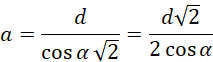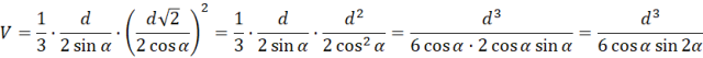 Mając dany ostrosłup prosty, którego podstawą jest kwadrat oraz wiedząc, że kąt, który tworzą dwie przeciwne krawędzie boczne, wynosi 2α,0° < α < 90°, a dystans pomiędzy wierzchołkiem, a krawędzią boczną leżącą naprzeciw niego wynosi d, określ objętość bryły.