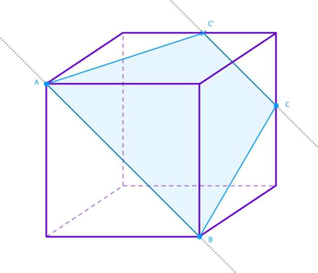 Naszkicuj płaszczyznę zawierającą punkty A, B i C. Wszystkie odcinki należące do płaszczyzny muszą być równoległe do odcinka AB. Zaznacz prostą CC’, równoległą do prostej AB. Trapez równoramienny ABCC’ to poszukiwany przekrój π.
