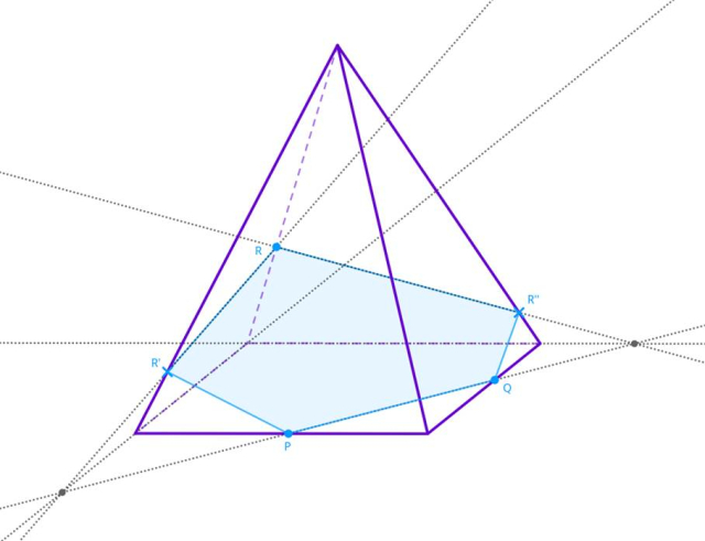 Naszkicuj płaszczyznę zawierającą punkty P, Q i R. Przeprowadź prostą PQ. Przeprowadź proste, do których należą krawędzie podstawy ostrosłupa w taki sposób, że każda z nich przetnie się w jednym punkcie z prostą PQ. Narysuj proste przez każdy z tych punktów przecięcia i przez punkt R. Utworzony w ten sposób pięciokąt PQR’’RR’ to poszukiwany przekrój π.