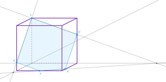 Naszkicuj płaszczyznę zawierającą punkty P, Q i R. Przeprowadź prostą PQ. Przeprowadź prostą, do której należy krawędź podstawy sześcianu w taki sposób, że przetnie się ona z prostą PQ. Przeprowadź prostą z tego punktu przecięcia przez punkt R. W podobny sposób przeprowadź prostą RR’, prostą zawierającą krawędź podstawy i połącz punkt przecięcia się tych prostych z punktem P. Utworzony w ten sposób pięciokąt PQRR’R’’ to poszukiwany przekrój π.