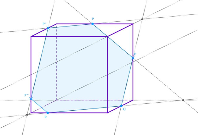 Naszkicuj płaszczyznę zawierającą punkty P, Q i R. Przeprowadź prostą RQ. Przeprowadź prostą, do której należy krawędź podstawy sześcianu w taki sposób, że przetnie się ona z prostą RQ. Przeprowadź prostą z tego punktu przecięcia przez punkt P. W podobny sposób przeprowadź prostą QP’, prostą zawierającą krawędź podstawy i połącz punkt przecięcia się tych prostych z punktem P. By dokończyć szkic, wyznacz jeszcze położenie punktu P’’’. Utworzony w ten sposób sześciokąt PP’QRP’’’P’’ to poszukiwany przekrój π.