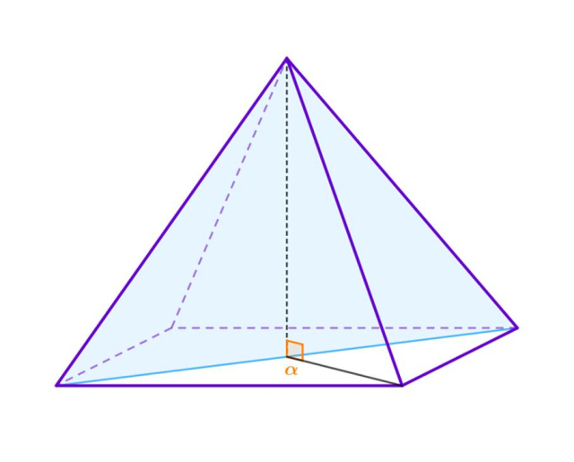 Niech dany będzie pewien ostrosłup prawidłowy czworokątny. Płaszczyzna π zawiera przeciwległe krawędzie boczne tego ostrosłupa. Naszkicuj przekrój ostrosłupa płaszczyzną π oraz wskaż kąt α utworzony między tą płaszczyzną a płaszczyzną podstawy.