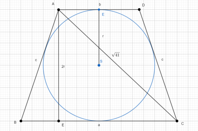 Skorzystaj z własności czworokąta opisanego na okręgu: suma przeciwległych boków jest równa. Wyznacz długość ramienia trapezu. Następnie policz długość odcinka EC w trójkącie AEC. Wstaw wyznaczone długości do tw. Pitagorasa dla tego trójkąta i wyznacz r.