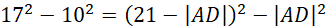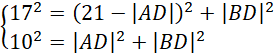 O wysokości podstawy |BD| wiadomo, że przecina bok |AD| pod kątem prostym, tworząc w ten sposób dwa trójkąty prostokątne. Ułóż układ równań z twierdzeń Pitagorasa dla każdego z tych trójkątów: