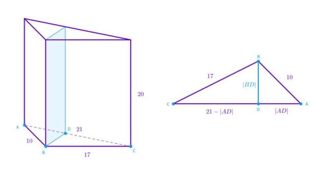 Na trójkącie o krawędziach 10, 17, 21 cm budowano graniastosłup prosty o wysokości 20 cm. Przez powstałą bryłę poprowadzono płaszczyznę, która przecięła najkrótszą wysokość podstawy wraz z przylegającą do niej krawędzią boczną. Oblicz pole tego przekroju.