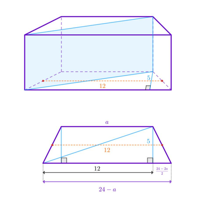 Oznacz jedną z podstaw długością 𝑎. Druga podstawa musi mieć więc długość 24 – 𝑎. W dłuższej podstawie znajduje się odcinek o długości 𝑎 wraz z dwoma „dodatkami” po lewej i prawej stronie o równych długościach. Długość każdego z tych „dodatków” jest równa: