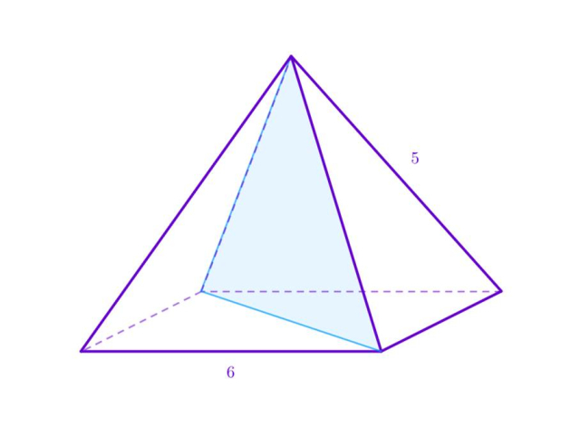 Dany jest pewien ostrosłup prawidłowy czworokątny o długości krawędzi podstawy równej 6 cm i długości krawędzi bocznej równej 5 cm. Przez bryłę przeprowadzono płaszczyznę w taki sposób, że zawiera ona przeciwległe krawędzie boczne ostrosłupa. Oblicz długości boków powstałego przekroju.