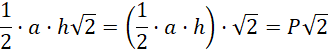 Zauważ, że podstawa oraz przekrój współdzielą krawędź podstawy. Zauważ również, że między wysokością podstawy opuszczoną na wspólną krawędź podstawy oraz jej rzutem prostokątnym na płaszczyznę przekroju jest zawarty kąt nachylenia płaszczyzny przekroju do płaszczyzny podstawy. Oznacz długość wspólnej krawędzi jako 𝑎, wysokość podstawy jako h. Zauważ, że wysokość przekroju to przeciwprostokątna trójkąta prostokątnego równoramiennego. Wysokość przekroju jest więc równa: