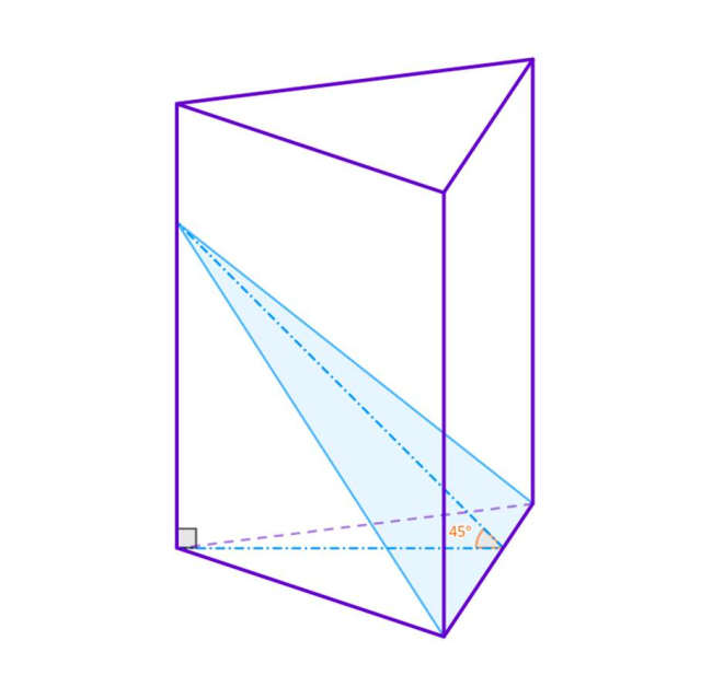 Dany jest pewien graniastosłup prosty trójkątny o polu podstawy 𝑃. Bryłę tą przecięto płaszczyzną przez krawędź podstawy w taki sposób, że jest nachylona do płaszczyzny podstawy pod kątem 45°. Oblicz pole powstałego przekroju.