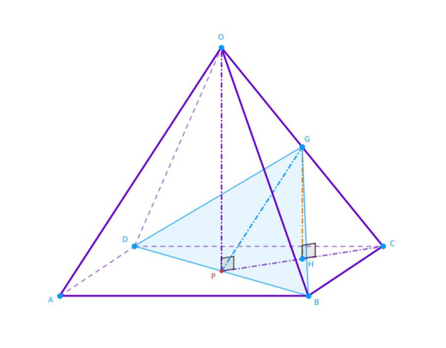Wykorzystaj długości charakterystycznych odcinków w podstawie (przekątna kwadratu) oraz podobieństwo figur w ostrosłupie, by wyrazić długości: podstawy oraz opuszczonej na nią wysokości przekroju za pomocą długości krawędzi bocznej i podstawy ostrosłupa.