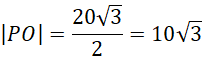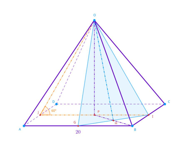 Zauważ, że skoro ostrosłup jest prawidłowy, to wszystkie ściany boczne są przystające i nachylone pod tym samym kątem do płaszczyzny podstawy. Trójkąt JOI składa się więc z przynajmniej dwóch kątów 60° - jeden przy punkcie J, a drugi przy I. Czyni to z niego trójkąt równoboczny. Wobec tego długość jego wysokości – odcinka PO jest równa: