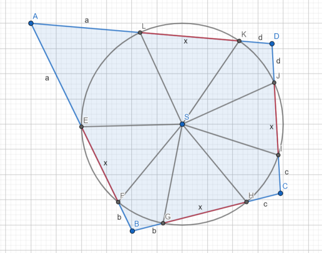 Wprowadź oznaczenia takie, jak na rysunku powyżej. Sprawdź warunek na okrąg wpisany w czworokąt, czyli czy suma długości naprzeciwległych boków czworokąta jest równa.