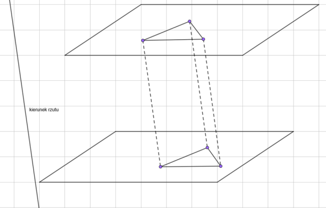 Zauważ, że obraz figury w rzucie równoległym powstaje przez poprowadzenie przez jej krawędzie oraz rzutnię, prostych równoległych do prostej wyznaczającej kierunek rzutu. Miejsca przecięcia tych prostych z rzutnią wyznaczają obraz. W momencie, gdy płaszczyzna, na której znajduje się figura oraz rzutnia, są równoległe, to w żaden sposób obraz figury nie zostanie zmieniony. Sytuację tą prezentuje rysunek poniżej:
