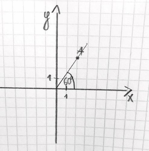 Aby rozwiązać to zadanie nanieś na układ współrzędnych punkt A i poprowadź przez niego półprostą, która ma swój początek w środku układu współrzędnych. Podaj miarę kąta.