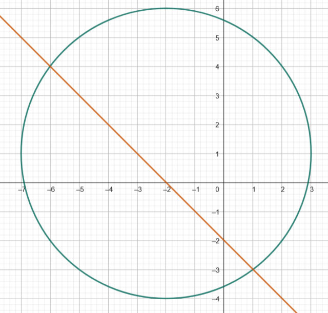 Ustal graficznie i rachunkowo wzajemne położenie prostej o okręgu o danych równaniach.y=x2,(x+2)2+(y1)2=25