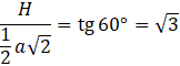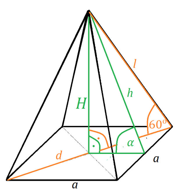 Oblicz, jaki będzie kąt nachylenia ścian do płaszczyzny podstawy ostrosłupa czworokątnego, w którym krawędzie ścian są nachylone do podłogi pod kątem 60º. Wynik podaj z dokładnością do jednego stopnia.