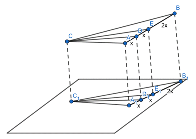 , jeśli wysokość CD trójkąta ABC dzieli podstawę AB na dwa odcinki, których długości pozostają w stosunku 1 : 3. Odcinek CE jest środkową tego trójkąta. Narysuj rzut równoległy tego trójkąta w przypadku, gdy bok AB jest równoległy do rzutni, a płaszczyzna (ABC) nie jest równoległa do rzutni i nie jest równoległa do prostej, wyznaczającej kierunek rzutowania.