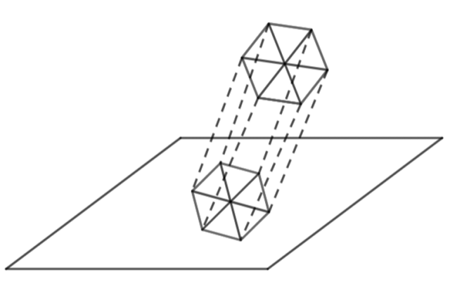 Zauważ, że rzut równoległy na płaszczyznę można określić jako cień, który rzuca prosta na daną płaszczyznę. Na tej podstawie zastanów się jaka prosta wyznacza rzut podany w treści zadania i ją narysuj. Następnie zapisz co można zauważyć o przekątnych obu sześciokątów.