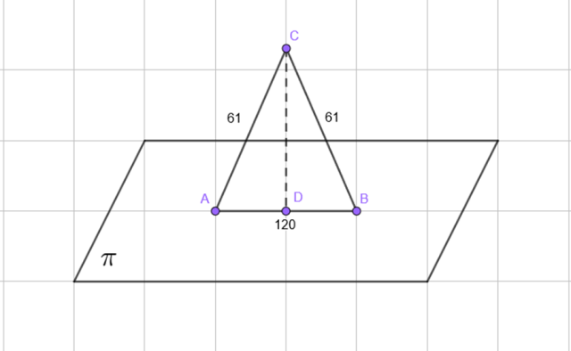 Wiedząc, że C znajduje się w przestrzeni poza płaszczyzną π, odcinek AB ma długość 120 cm i leży na płaszczyźnie π, |AC| = |BC| = 61 cm oraz prosta poprowadzona z punktu C jest prostopadła do płaszczyzny π i przecina odcinek AB. Wyznacz dystans pomiędzy punktem C a płaszczyzną π.