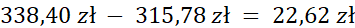 Najpierw obliczamy, ile pani Anna otrzymało dolarów kanadyjskich po pierwszym kursie. Następnie obliczamy, ile złotówek otrzymała po ponownej wymianie pozostałej reszty pieniędzy (jest to inny kurs niż przy pierwszej wymianie). Na końcu liczymy, ile pani Anna otrzymałaby złotówek, gdyby sprzedała je zgodnie z pierwszym kursem. Obliczamy różnicę otrzymanych wartości – tyle straciła pani Anna na wymianach.