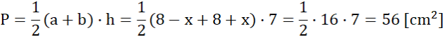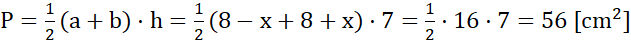Należy obliczyć pole trapezu równoramiennego. Wiadomo, że jego wysokość wychodząca z kata rozwartego ma 7 cm oraz dzieli dłuższą podstawę na dwa odcinki. Dłuższy z tych odcinków ma 8 cm.