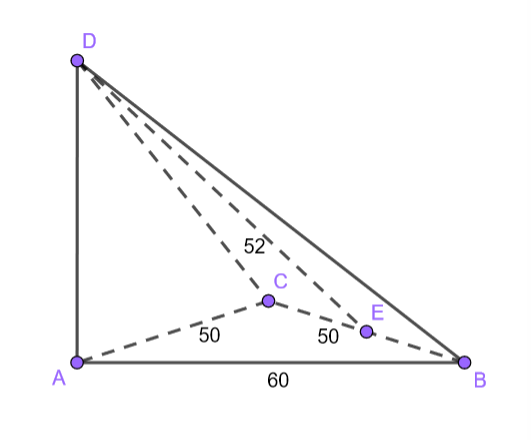 Wiedząc, że odcinki A, B, C są współpłaszczyznowe i tworzą trójkąt równoramienny, gdzie podstawą jest bok AB o długości 60 cm, a ramiona mają długość 50 cm, odcinek AD tworzy kąt prosty z płaszczyzną zawierającą trójkąt ABC oraz długość odcinka mającego początek w punkcie D, a koniec na odcinku BC wynosi 52 cm i jest prostopadły do BC, wyznacz długość odcinka AD.