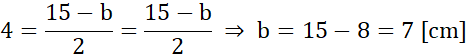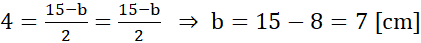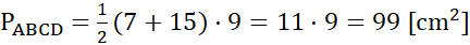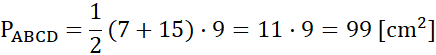 Należy obliczyć pole trapezu równoramiennego, Wiadomo, że dłuższa podstawa ma 15 cm, wysokość ma 9 cm, a odcinek łączący środku przekątnych ma 4 cm.