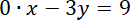 Para liczb spełnia równanie, jeśli po podstawieniu tych liczb do równania zachodzi równość. Znajdź trzy pary liczb spełniające równanie 0x – 3y = 9. Następnie naszkicuj wykres równania (wyznacz z równania y i narysuj tak jak wykres funkcji liniowej) i zaznacz na nim wymienione wcześniej punkty.