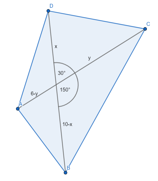 W tym zadaniu musisz policzyć pole czworokąta na podstawie jego przekątnych i kąta między nimi.