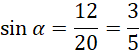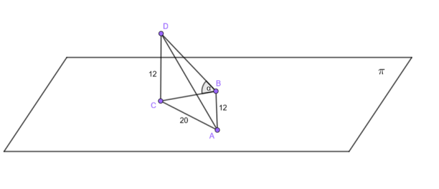 Wiedząc, że punkty A, B, C są współpłaszczyznowe, a płaszczyzna jest oznaczona jako π, dodatkowo tworzą trójkąt prostokątny ABC, gdzie kąt prosty jest przy wierzchołku B, długość przeciwprostokątnej wynosi 20, a długość boku AB wynosi 12. Rzut prostokątny punktu D na płaszczyznę π pokrywa się z punktem C oraz |CD| = 12, określ sinus kąta pomiędzy płaszczyzną ABD i płaszczyzną π.