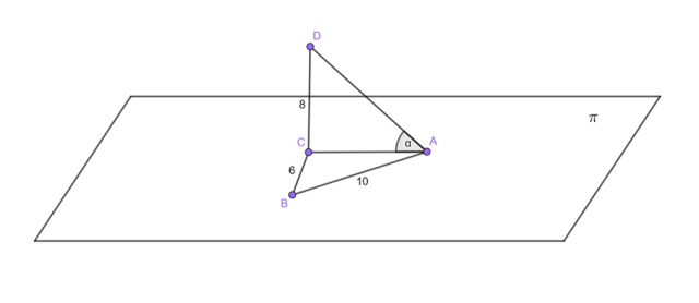 Wiedząc, że punkty A, B, C są współpłaszczyznowe, a płaszczyzna jest oznaczona jako π, dodatkowo tworzą trójkąt prostokątny ABC, gdzie kąt prosty jest przy wierzchołku C, długość przeciwprostokątnej wynosi 10, a długość boku BC wynosi 6. Rzut prostokątny punktu D na płaszczyznę π pokrywa się z punktem C oraz |CD| = 8, określ miarę kąta pomiędzy odcinkiem AD i płaszczyzną π.
