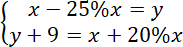 Drugie równanie układu powstało ze zdania: jeśli do mniejszej liczby dodamy 9, to otrzymana suma będzie o 20% większa od drugiej szukanej liczby.