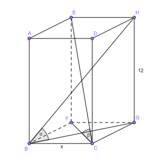 Wiedząc, że krótsza i dłuższa przekątna w graniastosłupie prostym, o podstawie rombu, tworzą z podstawą kąty odpowiednio β, α, gdzie β = 60°, α = 45° oraz jego krawędź boczna ma długość 12 cm, wyznacz długość podstawy.