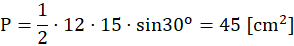 Należy obliczyć pole czworokąta wypukłego, wiedząc, że jego przekątne wynoszą 12 cm i 15 cm oraz przecinają jeden z jego boków pod kątami