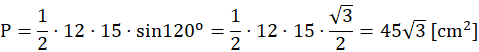Należy obliczyć pole czworokąta wypukłego, wiedząc, że jego przekątne wynoszą 12 cm i 15 cm oraz przecinają jeden z jego boków pod kątami