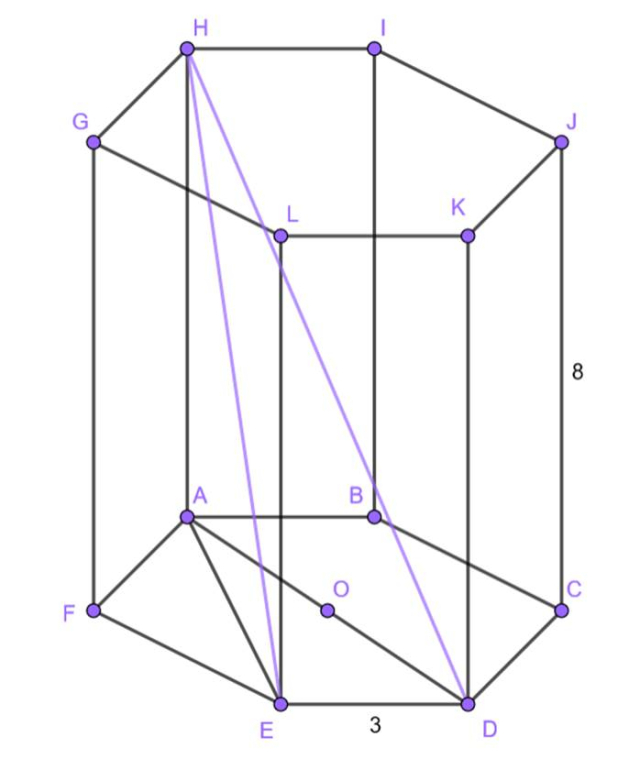 Wiedząc, że podstawą graniastosłupa prostego jest sześciokąt foremny, długość boku podstawy wynosi 3 cm, a wysokość graniastosłupa – 8 cm, określ długość krótszej i dłuższej przekątnej bryły.