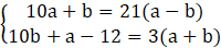 W tym zadaniu musisz wskazać szukaną dwucyfrową liczbę, która jest 21 razy większa od różnicy między jej cyfrą dziesiątek i cyfrą jedności, przy przestawieniu cyfr tej liczby i od nowo otrzymanej liczby odejmiemy 12, to różnica będzie trzy razy większa od sumy cyfr szukanej liczby.