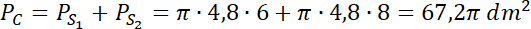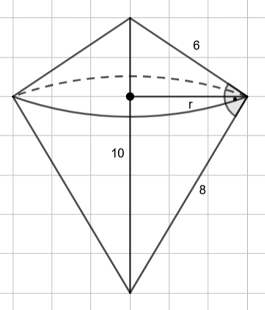 Na koniec zauważ, że powstała bryła składa się z dwóch stożków, dla których pole całkowite jest sumą ich pól bocznych, które można obliczyć ze wzoru