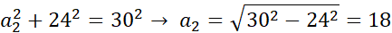 Trójkąt równoramienny o ramieniu 30 cm i wysokości opuszczonej na podstawę równej 24 cm przyjmijmy za trójkąt nr 2. Z opisu możemy obliczyć długość połowy podstawy trójkąta równoramiennego za pomocą twierdzenia Pitagorasa: