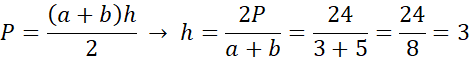 Na początek obliczmy wartość wysokości w drugim trapezie (trapez prostokątny o podstawach 3 i 5 oraz polu 12):