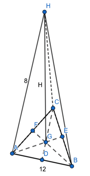 Wyznacz miarę kąta nachylenia krawędzi bocznej ostrosłupa do płaszczyzny podstawy, jeśli w ostrosłupie prawidłowym trójkątnym krawędź podstawy ma długość 12 dm, a krawędź boczna 8 dm.